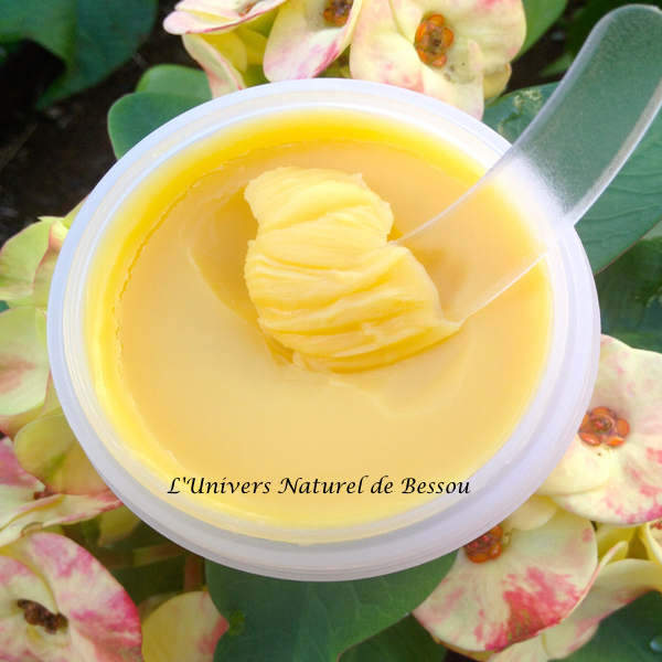 – Beurre de karité brut bio (Riche en vitamine A, D, E, F, nourrit et protège la fibre capillaire)