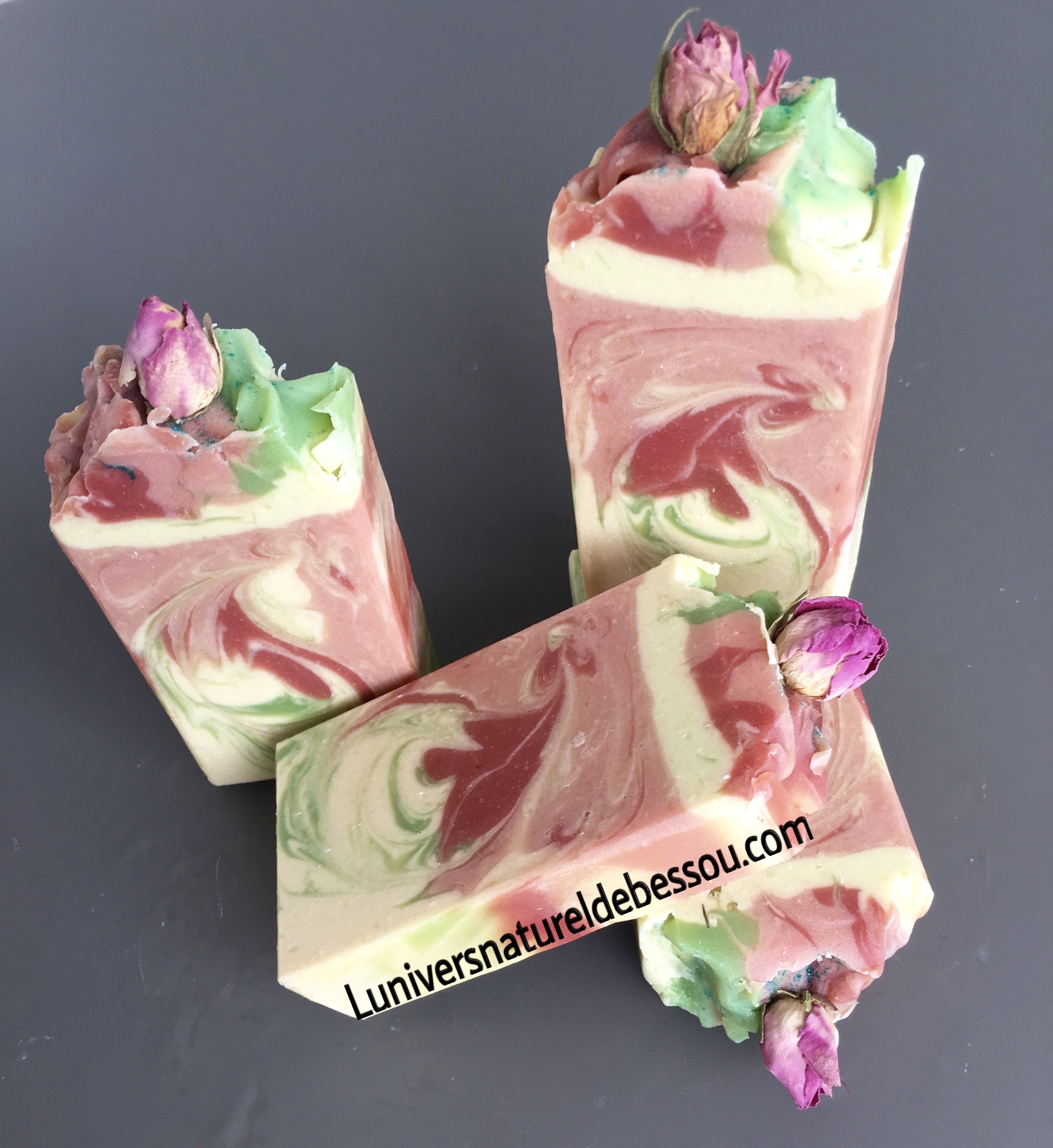 Aujourd’hui, je vous présente mon dernier savon centré sur la rose. En effet, Je voulais un savon régénérant rien que pour moi que j’ai surgraissé à l’huile de rose musquée pour prendre soin de ma peau.