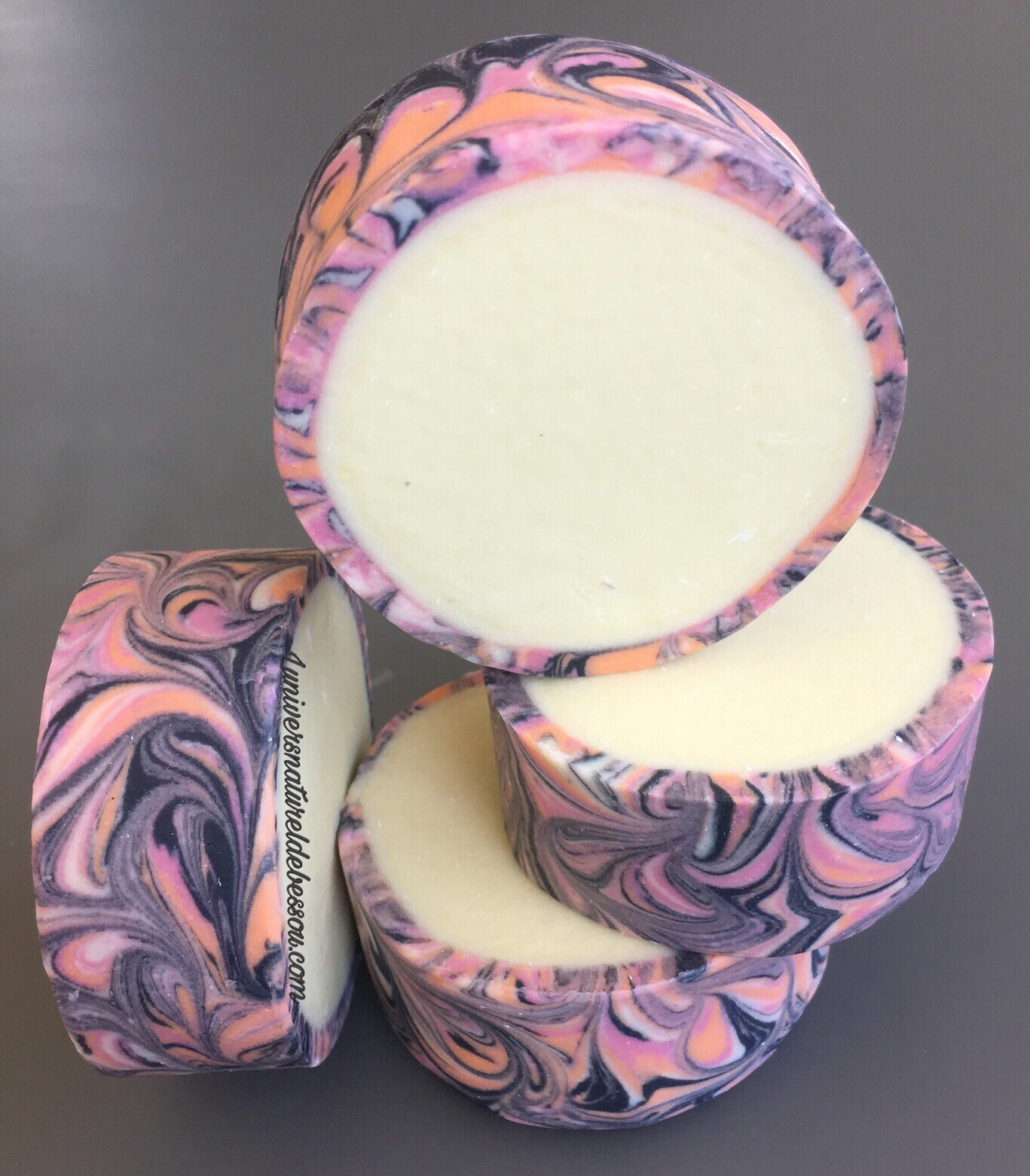 Aujourd’hui je vous présente un savon que j’ai pris beaucoup de plaisir à faire. Il a été réalisé sur deux jours : un premier savon pour constituer le contour et 24 heures plus tard le savon rond en lui-même. J’ai choisis de le parfumer avec une fragrance que j’affectionne tout particulièrement « Cachemire & Soie »